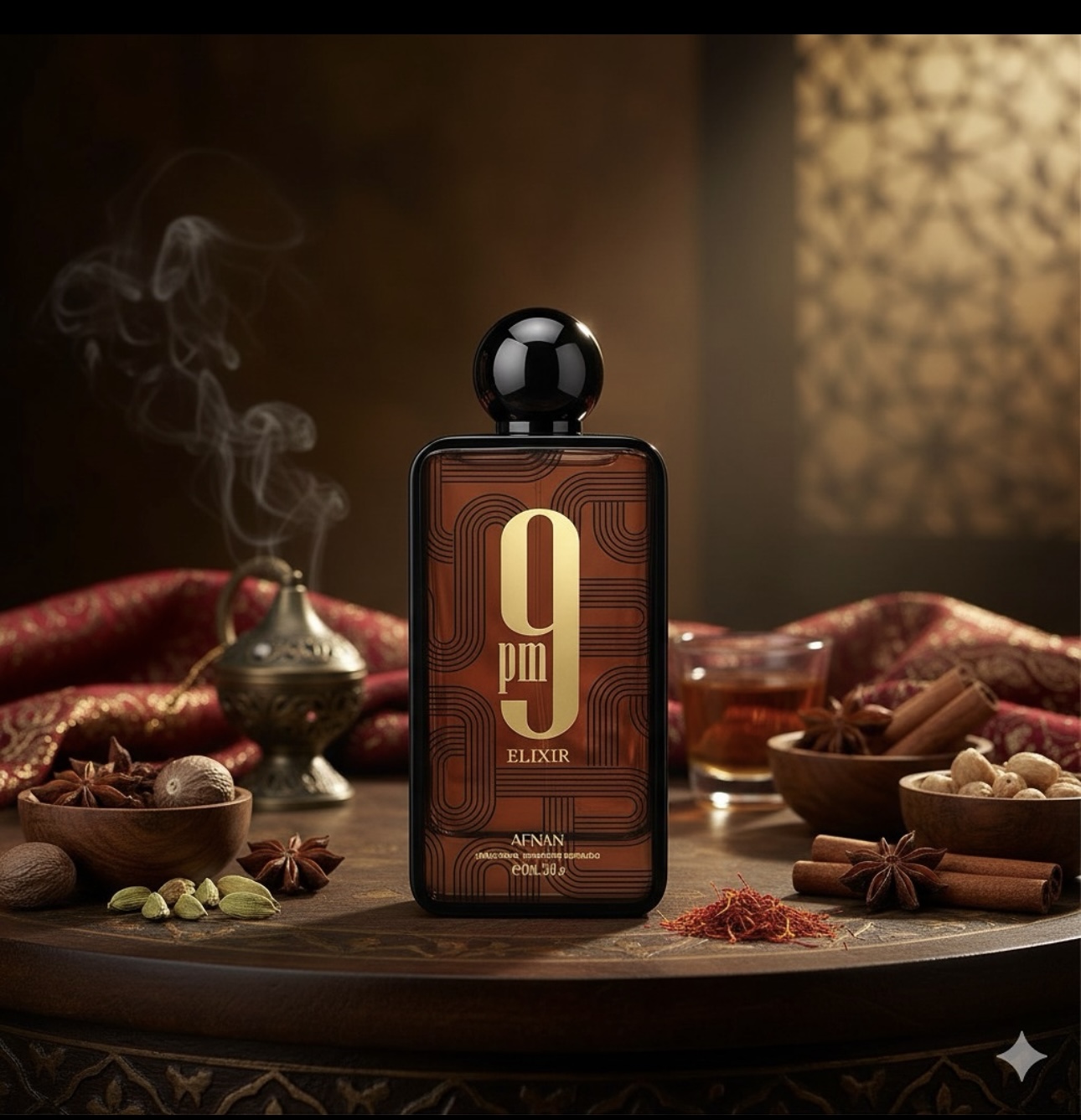 9PM Elixir de Afnan é um perfume Oriental Especiado Compartilhável. Esta é uma nova fragrância. 9PM Elixir foi lançado em 2025. O perfumista que assina esta fragrância é Imran Fazlani. As notas de topo são: Cardamomo, Noz-moscada e Elemi. As notas de coração são: Pimenta da Jamaica, Couro e Lavanda. As notas de fundo são: Baunilha, Patchouli, Ládano e Rockrose | Cistus.