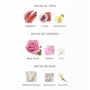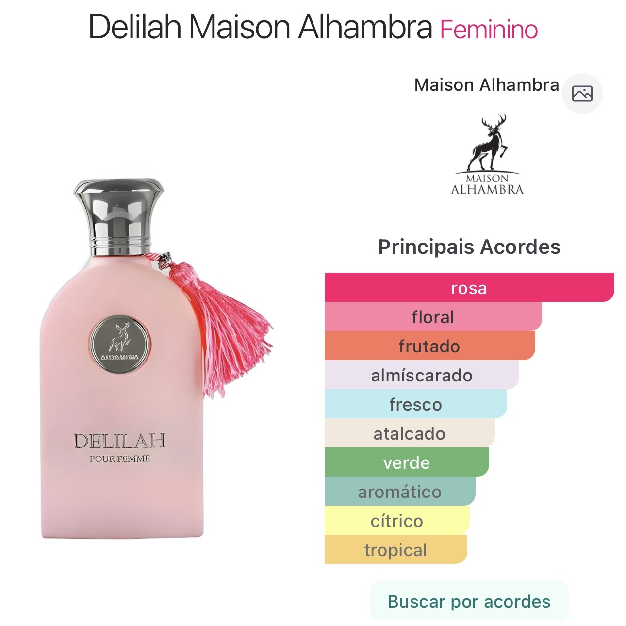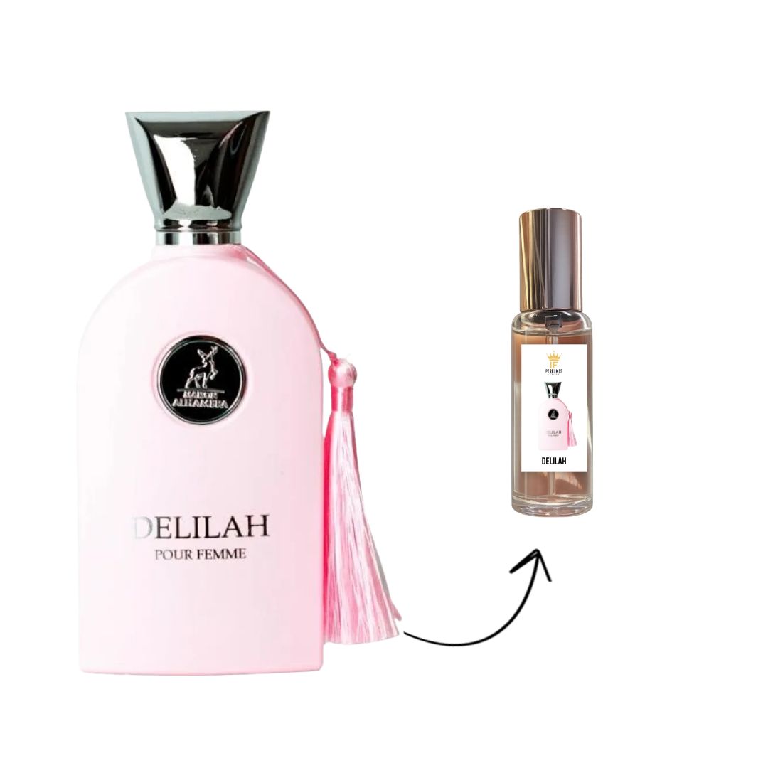 Delilah de Maison Alhambra é um perfume Floral Frutado. As notas de topo são: Ruibarbo, Lichia e Bergamota. As notas de coração são: Rosa Turca, Peônia e Lírio. As notas de fundo são: Almíscar Branco, Cashmeran e Baunilha.