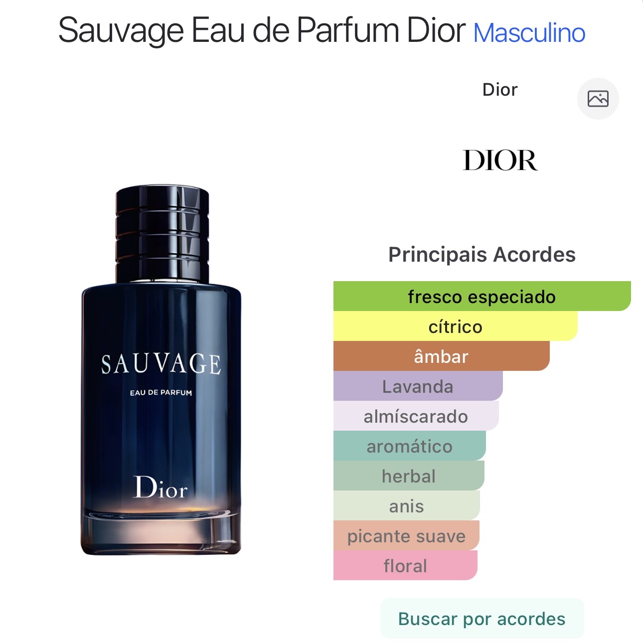 Sauvage Eau de Parfum de Christian Dior é um perfume Oriental Fougére Masculino. A nota de topo é Bergamota as notas de coração são Pimenta de Szechuan, Lavanda, Anis estrelado e Noz-moscada as notas de fundo são Ambroxan e Baunilha.