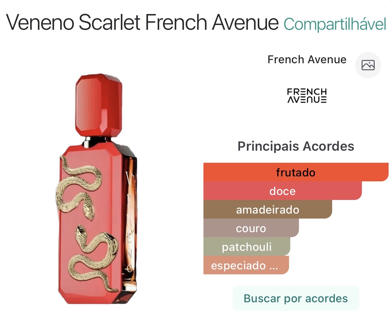 Veneno Scarlet de French Avenue é um perfume Oriental Gourmand. As notas de topo são: Morango, Amora e Caramelo. As notas de coração são: Framboesa, Cedro e Canela. As notas de fundo são: Couro, Patchouli, Abeto, Caramelo, Fava Tonka e Baunilha.