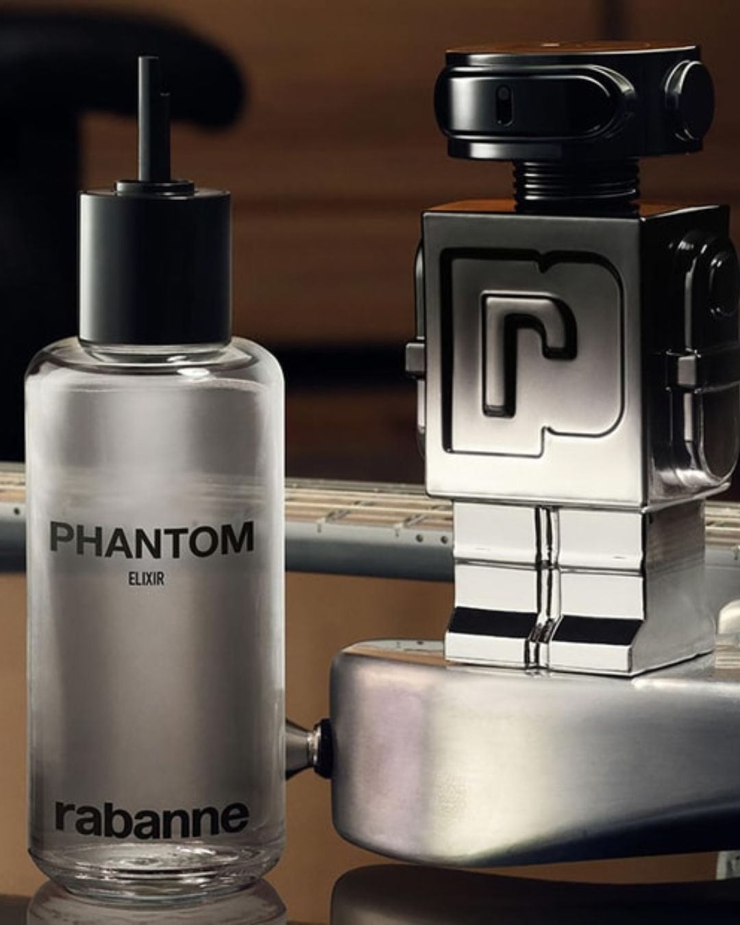 O frasco icônico de Phantom ganha uma aura ainda mais intensa e misteriosa em sua versão Elixir, refletindo inovação, tecnologia e ousadia — características marcantes da identidade Rabanne.